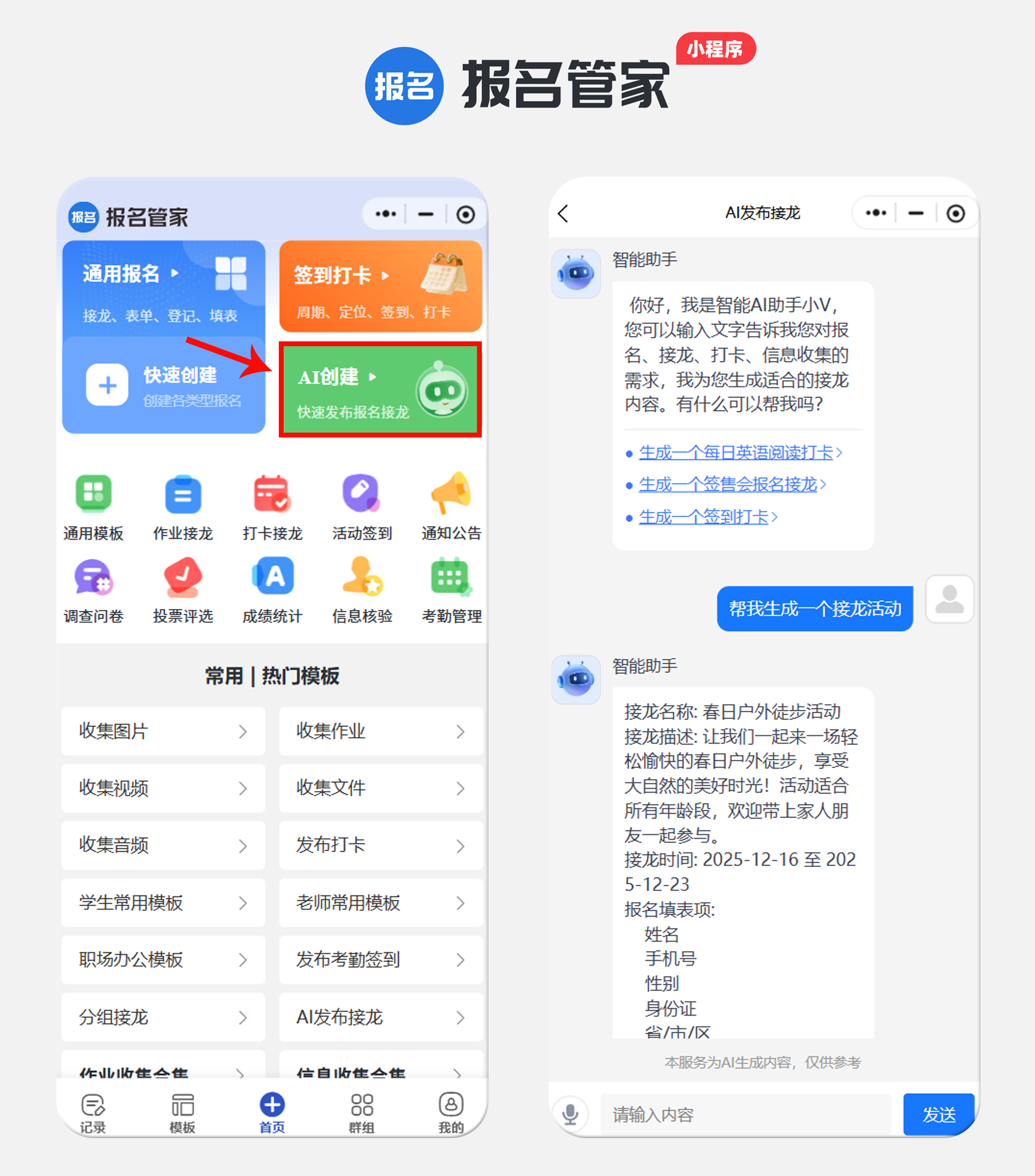 首页提供了多种创建方式:可以在模板库中直接搜索“培训”、“报名”等关键词,快速选用现成的模板;如果找不到完全符合的,推荐使用“AI 创建”功能,只需简单描述您的活动需求,系统便能智能生成一个初步的报名模板,极大地节省了构思时间。