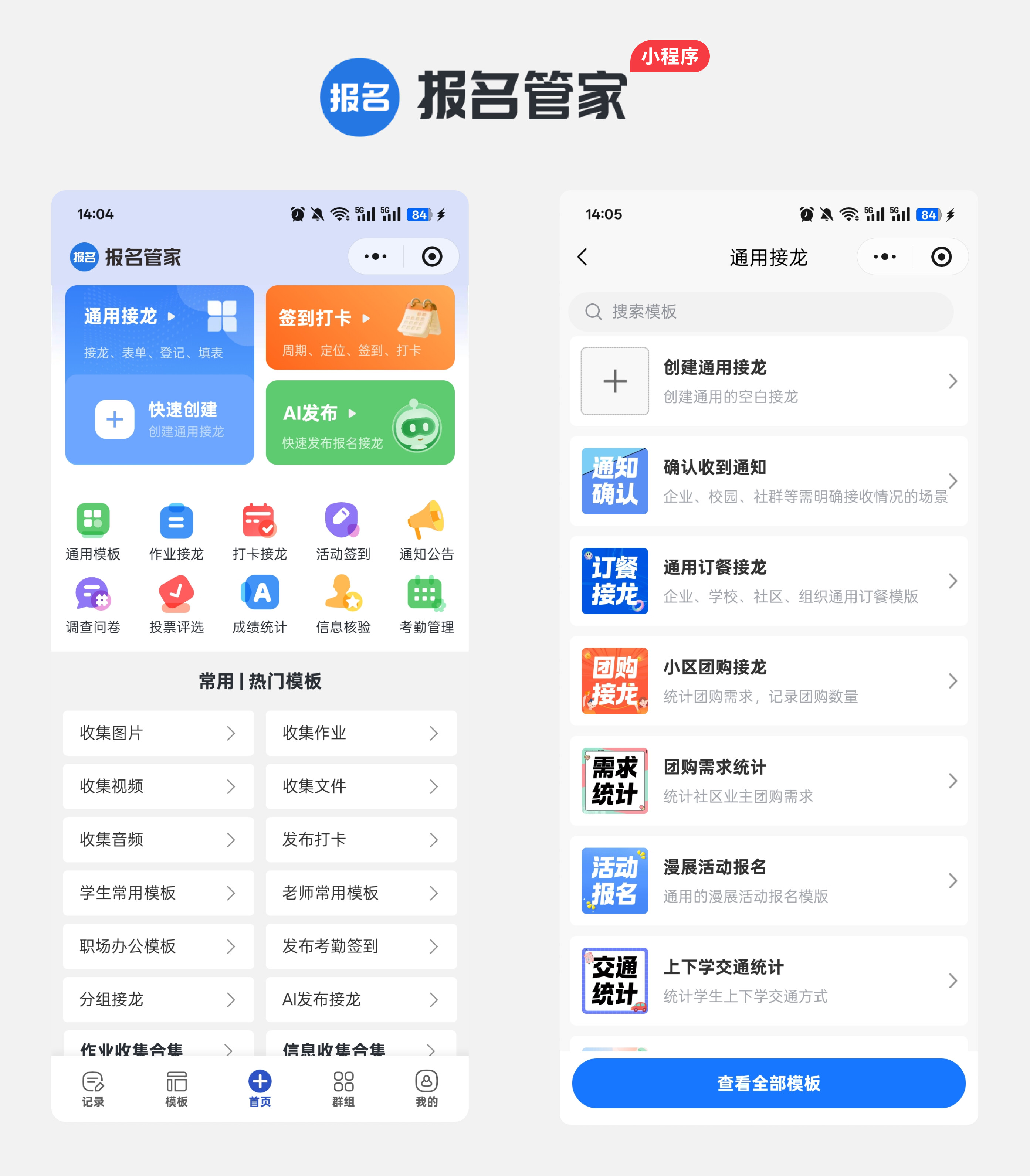 打开报名管家,有两种制作报名的方式可以选择,一个是模板,一个是 AI 创建。