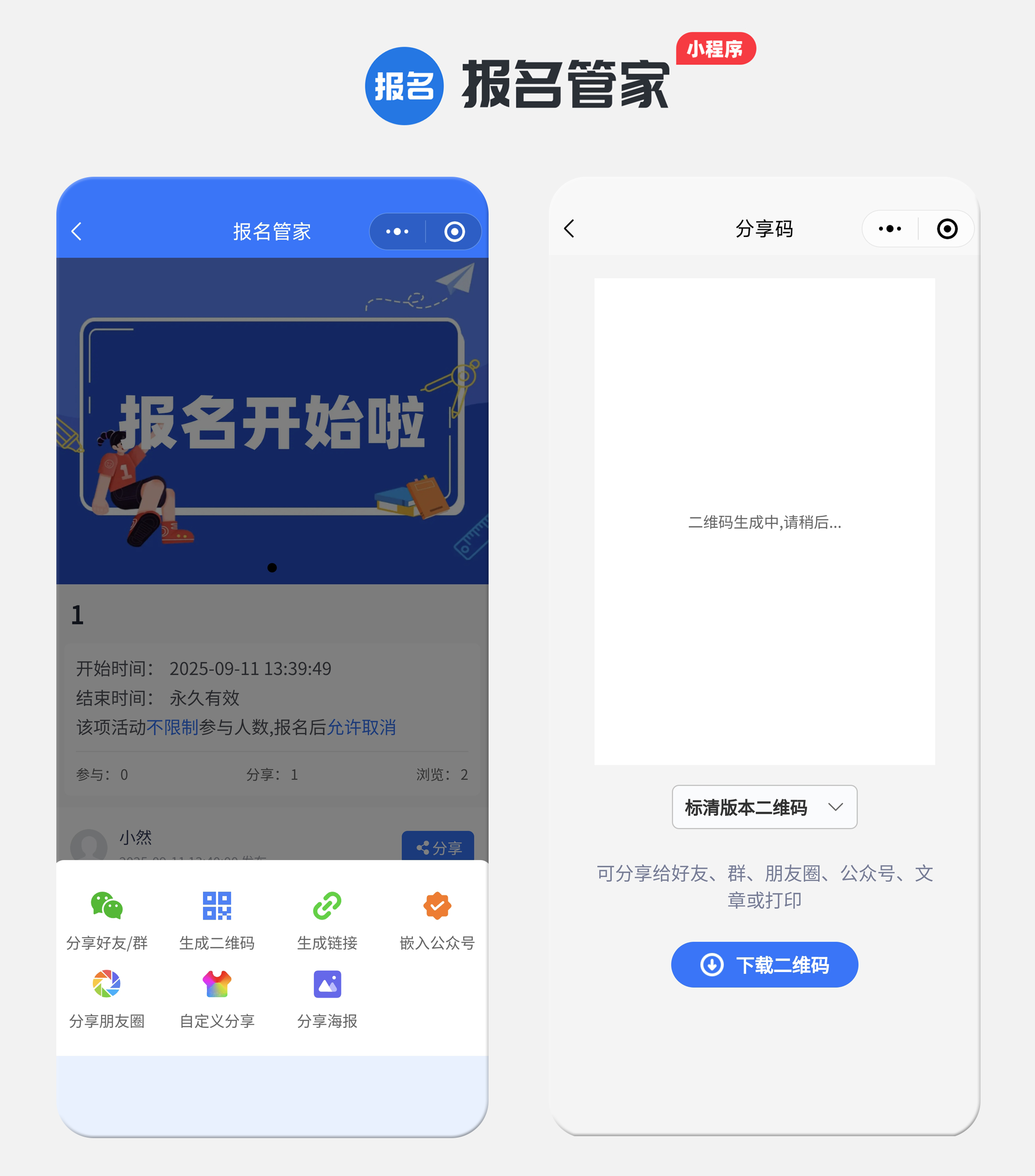 检查好所有内容制作,点击“发布”按钮,活动就制作完成啦!然后点击活动页面左侧的“管理”按钮,在其中找到“分享转发”。这样系统会立即生成该活动的链接和二维码。这样既可以随时发到群聊和朋友圈中,还可以制作成专属海报,或者打印出表单进行招生推广。