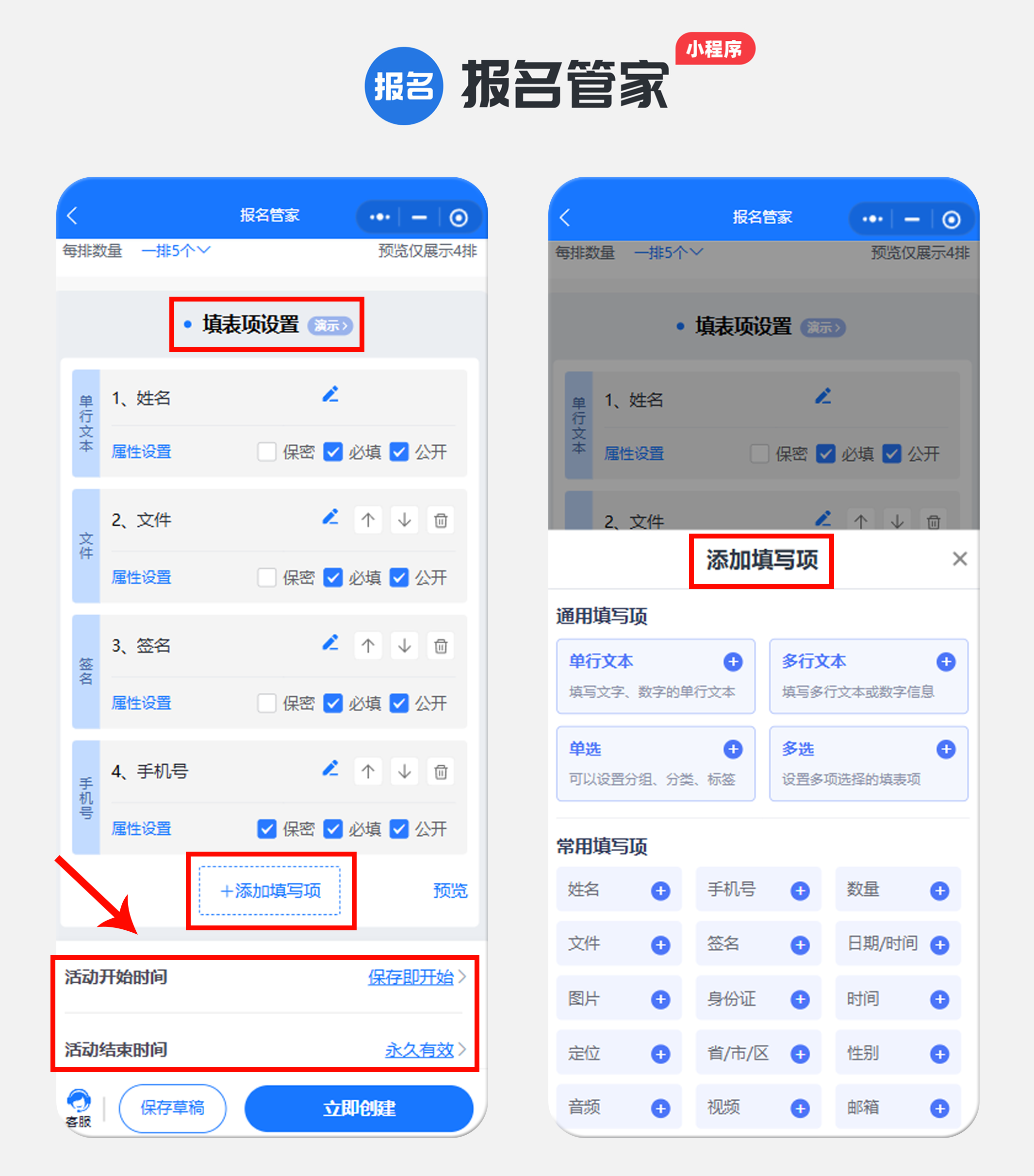 在“填表项设置”中,添加大家需要收集的信息字段。系统支持文本、单选、多选、图片、文件上传等多种格式。