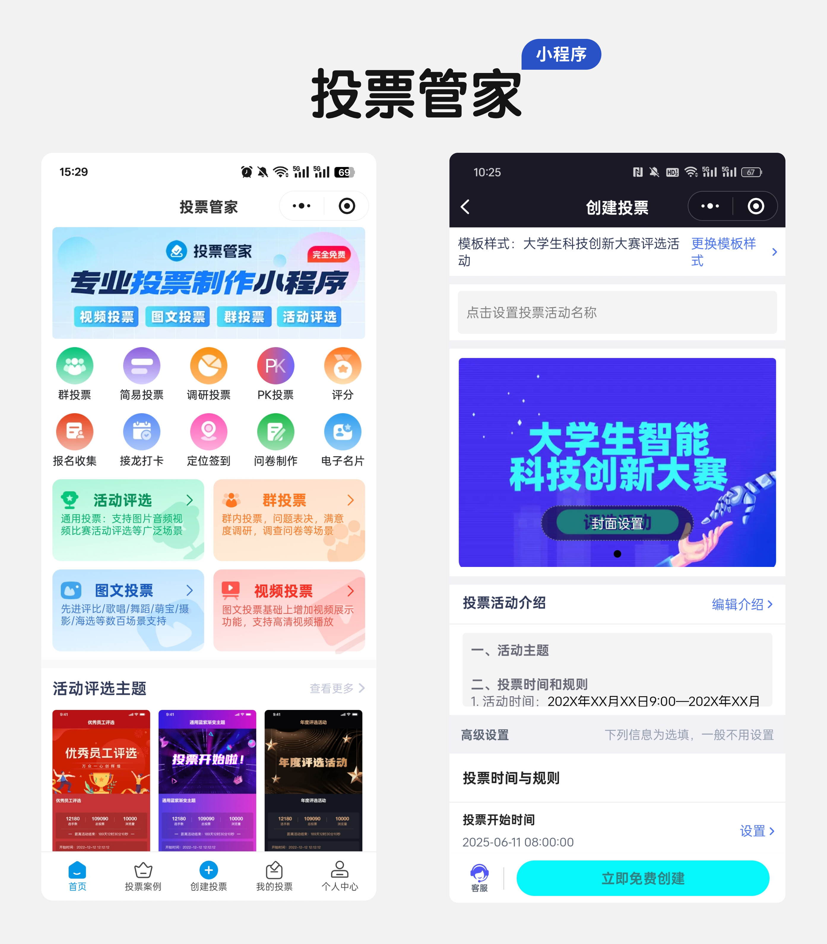 1、打开微信搜索“投票管家”,进入小程序后点击底部“创建投票”按钮,选择“活动评选”模式(支持图文、视频、音频等多种形式)。接下来只需三步: